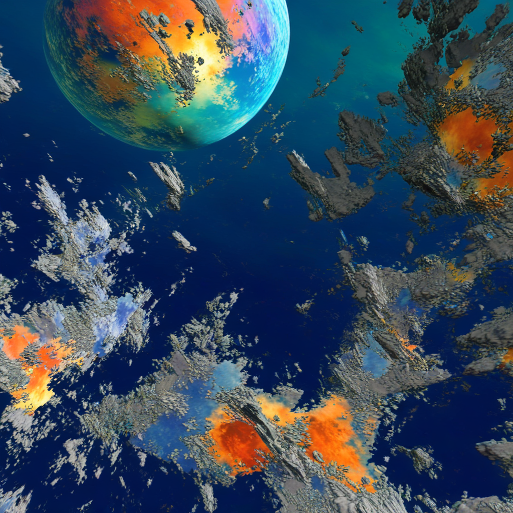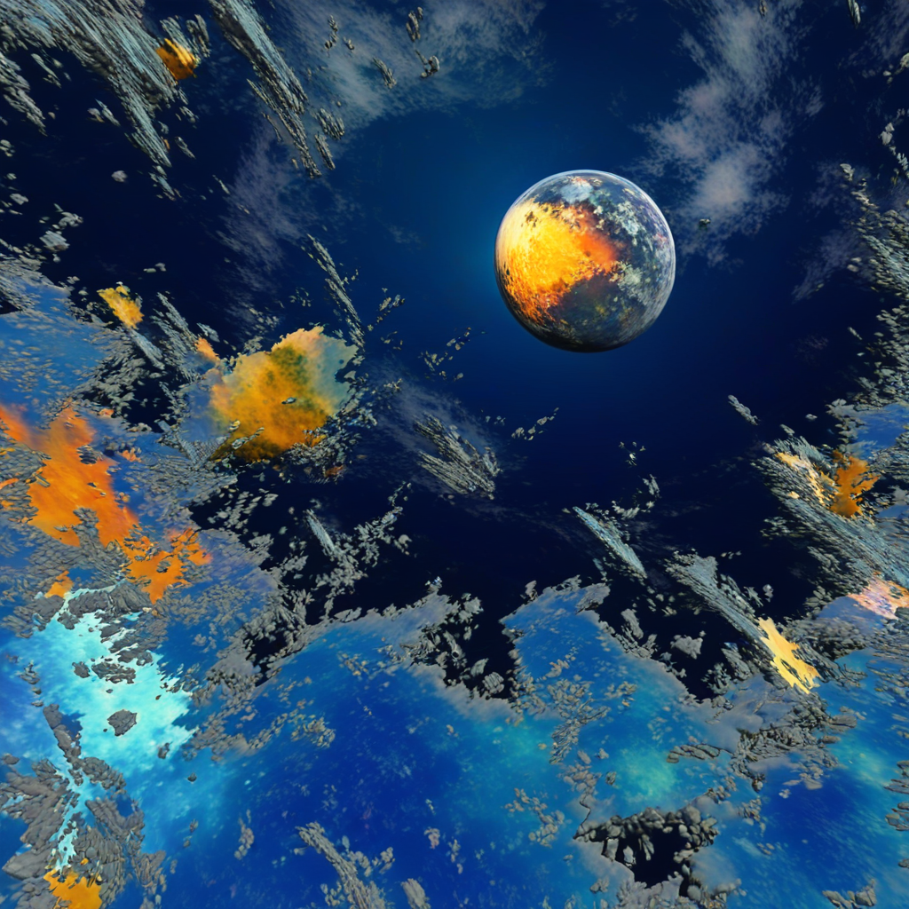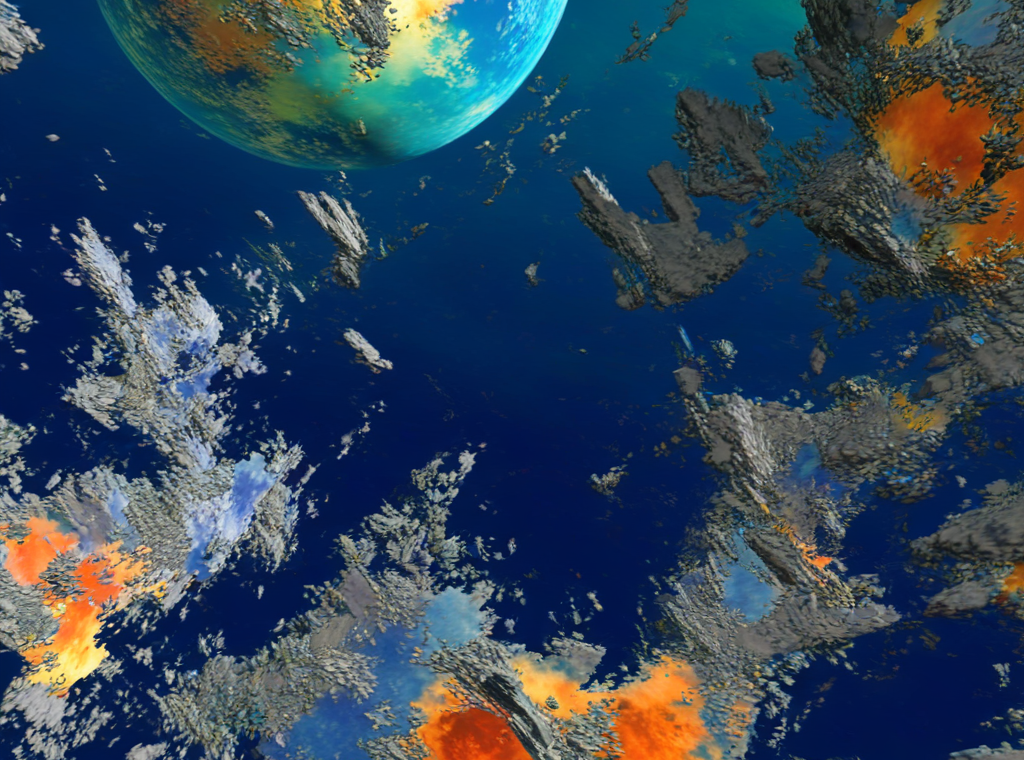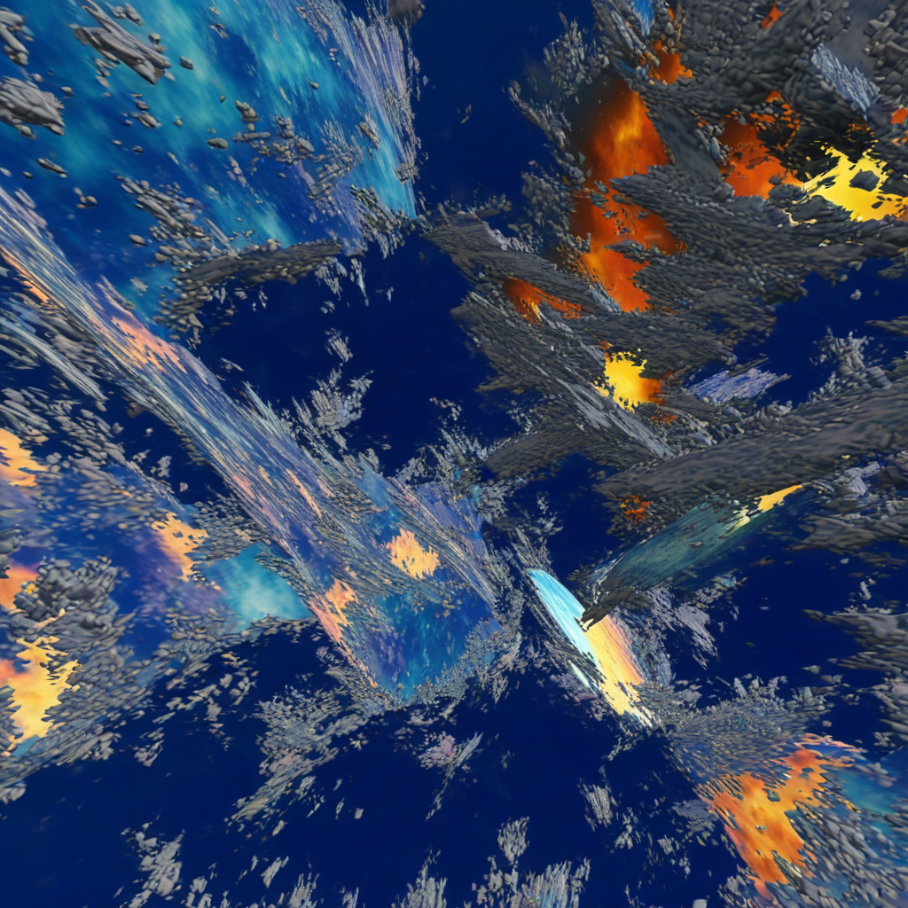 Les formes qui émergent semblent flotter dans un espace sans gravité, entre matière et énergie, évoquant des fragments de mondes en dispersion, des paysages en mutation ou des vestiges d’un territoire quitté.